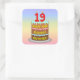Ce design amusant et joyeux d'autocollant carré à thème d'anniversaire présente une représentation de type dessin animé d'un gâteau d'anniversaire à trois niveaux avec des bougies en forme de chiffres sur le dessus montrant le numéro "19", avec le message "HAPPY 19TH BIRTHDAY," et un nom de destinataire modifiable. L'arrière - plan a un motif multicolore pastel arc-en-ciel inspiré du spectre dégradé. Des autocollants colorés sur le thème de l’anniversaire, comme ceux-ci, peuvent être donnés ou utilisés lors d’une fête célébrant le dix-neuvième anniversaire de quelqu’un, ou peut-être utilisés lors de la préparation d’invitations ou d’enveloppements de cadeaux pour un tel événement. [~Z0000624]