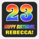 Ce sticker coloré, joyeux et amusant à thème d'anniversaire comporte un grand nombre de "23" et le message "HAPPY BANTHDAY", tous deux colorés avec un motif inspiré par un gradient de spectre arc-en-ciel, avec un nom personnalisé jaune gras. L'arrière - plan est noir de couleur. Des autocollants sur le thème de l'anniversaire amusant comme celui-ci pourraient être utilisés pour envelopper un cadeau ou un cadeau offert à quelqu'un qui célèbre son 23e anniversaire, ou peut-être être remis aux invités à une fête d'anniversaire. [~Z0000480]