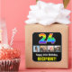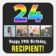 Ce modèle d'autocollant carré à thème d'anniversaire joyeux et optimisé comprend un grand nombre de "24" ayant un motif multicolore inspiré du spectre arc-en-ciel, plus le message "Happy 24th Birthday," et un nom de destinataire personnalisable. Il y a aussi des photos qui peuvent être personnalisées, peut-être avec des photos du destinataire, de la famille et des amis du destinataire et/ou de l’expéditeur d’un cadeau. Des autocollants comme ceux-ci peuvent être utilisés pour célébrer le vingt-quatrième anniversaire de quelqu’un. (Photographie © Storytree Studios, Stanford, CA.) [~Z0000670]