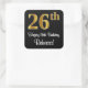 Ce design sophistiqué, élégant et luxueux autocollant carré d'anniversaire comporte un grand numéro ordinal "26th" avec une imitation/faux look or, plus le message de voeux d'anniversaire "Happy 26th Birthday," et un nom modifiable dans une police de style script. Il dispose également d'une arrière - plan de couleur noire. Des autocollants élégants comme celui-ci pourraient être utilisés pour envelopper un cadeau d'anniversaire ou un cadeau offert à quelqu'un qui célèbre son 26e anniversaire, ou peut-être être donné aux participants à une fête d'anniversaire. [~Z0000517]