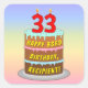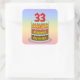 This fun and joyful birthday square sticker design objets a cartoon-style depiction of a three-tier birthday cake having numeral-shaped candles on top showing the number 33, along with the message "HAPPY 33RD BIRTHDAY," et cipia custom renom The background has a multi-color pastel rainbow spectrum ergradient pattern. Stickers like these might be given out or used at a birthday party for somebody who is celebrating their thirty third birthday , or perhaps used when peparing invitations or wrapping presents/toxiques for such event. 2.