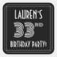 Cet élégant autocollant carré de fête/fête de trente-troisième anniversaire comporte un nom personnalisable, un look art déco fantaisie inspiré numéro "33ème", le message "FÊTE D'ANNIVERSAIRE !", et un motif frontalier composé de lignes. Il a un arrière - plan de couleur noire par défaut, mais il peut être customisé à une couleur différente, si désiré. Des autocollants de luxe comme ceux-ci peuvent être utilisés ou distribués lors d'une fête d'anniversaire organisée pour quelqu'un pour célébrer leur 33e anniversaire, ou peut-être utilisés lors de la préparation de cadeaux/cadeaux ou d'invitations pour un tel événement. [~Z0000617]
