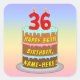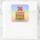 This joyful and colorful birthday square sticker designs a cartoon-style depiction of a three-tier birthday cake having numeral-shaped candles on top showing the number 36, along with the message "HAPPY 36TH BIRTHDAY," et a customizable recipient name The background has a multi-color pastel rainbow spectrum ergradient pattern. Stickers like these might be distributed or used at a party for somebody who is celebrating their thirty sixth birthday, or perhaps used when wrapping presents/toxiques or peparing invitations for event. 2.