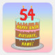 This cheerful and joyful birthday-themed square sticker design features a cartoon-style depiction of a three-tier birthday cake having numeral-shaped candles on top showing the number “54“, along with the message “HAPPY 54TH BIRTHDAY,”, and a custom recipient name. The background has a multi-color pastel rainbow spectrum inspired gradient pattern. Upbeat birthday themed stickers like these might be used or distributed at a party for somebody who is celebrating their fifty fourth birthday, or perhaps used when preparing invitations or gifts for such an event. [~Z0000624]