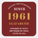 Un autocollant classique personnalisé pour cette célébration d'anniversaire pour une femme spéciale née en 1961 et ayant 60 ans. Ajoutez le nom à ce design vintage de style rétro rouge, blanc et or pour un cadeau personnalisé de 60ème anniversaire. Modifiez facilement le nom et l'année avec le modèle fourni. Un merveilleux cadeau d'anniversaire personnalisé. Plus de cadeaux et de fournitures de fête pour cette 60e fête disponibles dans le magasin.