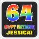 Ce design coloré, amusant et gai autocollant d'anniversaire comporte un grand nombre de "64" et le message "HAPPY BANTHDAY", tous deux colorés avec un motif inspiré par un gradient de spectre arc-en-ciel, ainsi qu'un nom jaune audacieux modifiable. L'arrière - plan est noir de couleur. Des autocollants amusants comme celui-ci pourraient être utilisés pour envelopper un cadeau d'anniversaire ou un cadeau offert à quelqu'un qui célèbre son 64e anniversaire, ou peut-être être donné aux invités à une fête d'anniversaire ou une fête. [~Z0000480]