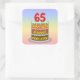 Ce design amusant et coloré d'autocollant carré à thème d'anniversaire présente une représentation de dessin animé d'un gâteau d'anniversaire à trois niveaux avec des bougies en forme de chiffres sur le dessus montrant le numéro "65", avec le message "HAPPY 65TH BIRTHDAY", et un nom de destinataire personnalisable. L'arrière - plan dispose d'un motif multicolore pastel en arc-en-ciel inspiré du spectre dégradé. Des autocollants à thème d'anniversaire comme ceux-ci peuvent être utilisés ou donnés à une fête d'anniversaire pour quelqu'un qui célèbre son 65e anniversaire, ou peut-être utilisés pour préparer des invitations ou des cadeaux pour un tel événement. [~Z0000624]