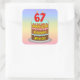 Ce design d'autocollant carré à thème d'anniversaire optimisé et joyeux présente une représentation de dessin animé d'un gâteau d'anniversaire à trois niveaux avec des bougies en forme de chiffres sur le dessus montrant le numéro "67", avec le message "HAPPY 67TH BIRTHDAY," et un nom de destinataire personnalisé. L'arrière - plan dispose d'un motif multicolore pastel en arc-en-ciel inspiré du spectre dégradé. Des autocollants sur le thème de l'anniversaire amusant comme ceux-ci peuvent être utilisés ou distribués à une fête pour quelqu'un qui célèbre son 67e anniversaire, ou peut-être utilisés pour préparer des cadeaux ou des invitations à un tel événement. [~Z0000624]
