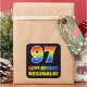 Ce design amusant, coloré et gai autocollant d'anniversaire comporte un grand nombre de "97" et le message "HAPPY BANTHDAY", tous deux colorés avec un motif inspiré par un gradient de spectre arc-en-ciel, ainsi qu'un nom personnalisable jaune gras. L'arrière - plan est noir de couleur. Des autocollants sur le thème de l’anniversaire amusant comme celui-ci pourraient être utilisés pour envelopper un cadeau ou un cadeau qui est donné pour célébrer le quatre-vingt-dix-septième anniversaire de quelqu’un, ou peut-être être donné aux participants à une fête d’anniversaire. [~Z0000480]