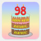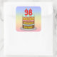 This joyful and colorful birthday square brodesobjets a cartoon-style depiction of a three-tier birthday cake having numeral-shaped candles on top showing the number 98, along with the message "HAPPY 98TH BIRTHDAY," et a custom res Les objets de panification ont été marqués. Cheerful birthday themed stickers like these might be used or distributed at a birthday party in celebration of somebody’s 98th birthday, or perhaps used when preparing invitations or wrapping toxits for such event. 2.