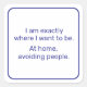 Cet autocollant est une vibe. Utilisez-le pour déclarer votre préférence pour la solitude pacifique. Le texte bleu foncé dit : "Je suis exactement là où je veux être. À la maison, en évitant les gens." Les autres couleurs disponibles sont le rose chaud, le rouge foncé, le noir et le vert foncé.