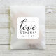 Les autocollants design moderne et chic en noir et blanc mariage "Love and Thanks" de faveur disposent d'un design typographique noir élégant avec script de calligraphie audacieux et élégant texte de date de mariage personnalisé qui peut être personnalisé.