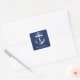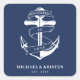 Autocollants bleu et blanc mariage nautique carré. Idéal pour un mariage de la Marine (militaire) ou d'une maison de lac. Le design comporte une ancre enveloppée dans une bannière avec le texte "Ancré dans l'amour". Personnalisez-le avec vos détails mariages.