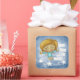 Un mignon ange lunaire habillé en bleu tient un fil qui passe à travers quatre étoiles. La légende est : "Elle a accroché les étoiles". Jolie constellation bleue remplie d'arrière - plan. Design original par Christie Black de Creations from the Heart.