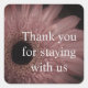 Les locations de maisons et de chambres deviennent de plus en plus compétitives. Mettez votre location de vacances à l'écart avec cet autocollant d'appréciation bon marché. Une belle photo de fleurs crée un élégant décor rose clair et noir ombragé pour vos mots d'appréciation envers vos invités. Les mots "merci de rester avec nous" apparaissent dans les pétales de fleurs et peuvent être changés rapidement et facilement pour répondre à vos besoins.