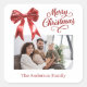 Un arrière - plan blanc, un texte rouge et un arc rouge. Texte et photo. Joyeux Noël est écrit avec une élégante police de style manuscrite.
