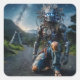 Un robot humanoïde aux yeux bleus lumineux s'agenouille sur un chemin menant à un temple antique, mêlant technologie et architecture historique. Le design complexe du robot et ses circuits exposés contrastent avec le paysage naturel. Les étoiles du soir scintillent doucement dans le ciel, renforçant l'atmosphère mystique de la scène.