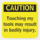 Attention. Toucher mes outils peut entraîner des lésions corporelles. Parodie du panneau de sécurité.