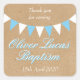BÉBÉ BUNTING BLUE BAPTISM CHRISTENING CARRÉ FAVORISER LES BÂTIMENTS. Ce joli autocollant de baptême, baptême ou première communion rustique présente un arrière - plan de style papier kraft, un bunting bleu et blanc, et une superbe calligraphie de script à l'ombre de goutte bleue. Customisez avec votre propre nom, date et message. Conçu par Pure Piglet© à l'adresse www.zazzle.com/purepiglet*.