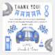 Carte d'invitation baby shower à thème de voiture de course avec des illustrations aquarelle d'une voiture de course bleue.