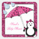 Pingouin super mignon avec cravate arc pois rose et avec un parapluie pois et étoiles avec pluie de gloire descendant mais quand le soleil brillant jaune étincelant sort, le parapluie est parti. Poof ! Parfait pour un baby shower de fille.