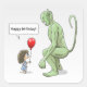 La fille dit heureux anniversaire à son ami le grand gobelin vert.