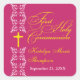 Un arrière - plan de couleur baies vitrées fait ressortir ce sticker First Holy Communion. Il combine un traitement de type moderne et une bande ornementale de style baroque avec une croix d'or brillante exposée au centre. Ajoutez un nom et une date d'événement ou toute autre information. Grande comme enveloppe scellée ou personnaliser à utiliser avec faveurs ou comme cadeau. Disponible en couleurs alternatives avec des produits correspondants.