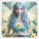 Une belle fée aux cheveux bleus aux ailes jaune pâle portant une jolie robe couleur aqua et un collier d'aquamarine tient une seule jonquille debout dans un champ de jonquilles. Le texte peut facilement être modifié ou supprimé si vous voulez l'image sans texte.