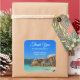 Mariage de faveur merci autocollants avec une photo d'une plage bleu turquoise de l'océan avec de gros rochers éparpillés le long de la côte. Région tropicale claire et ensoleillée.