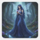 Une belle fée portant une robe bleu foncé coulante et un collier de saphirs avec des saphirs dans ses longs cheveux bleu foncé et des ailes translucides comme des libellules tenant un aster se dresse dans un étang peu profond dans une forêt magique entourée de maîtres, de champignons oranges et d'arbres couverts de vignes, de fleurs et de champignons.