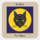 A retro-looking illustration of the face of a yellow-eyed black cat appears in a moon-like circle in this original Halloween-appropriate art by Richard H. Fay.
