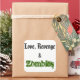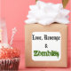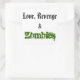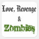 sticker carré blanc avec "Love, Revenge & Zombies" dessus. Feuille de 6