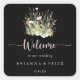 Cet autocollant de carré de bienvenue de fleur sauvage noir et boho vert est parfait pour un mariage rustique. Le design est composé de fleurs sauvages roses, roux, jaunes et blancs agrémentés d'élégants bouquets. Ces étiquettes sont parfaits pour les sacs de bienvenue et les mariages de destination des clients de l'hôtel.
