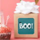 Boo! design de texte pour Halloween avec chat, araignée, hibou et araignée décoration sur arrière - plan bleu grunge.