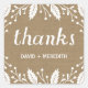 Cet autocollant de remerciement a un arrière - plan de style papier kraft, feuillage d'hiver blanc, et le mot "Merci" écrit dans une calligraphie assez audacieuse.