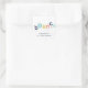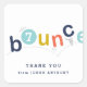L'autocollant de remerciement pour la fête d'anniversaire de rebond comporte des lettres rebondissantes en bleu marine, aqua, jaune et orange avec un âge modifiable en blanc à l'intérieur de l'O. Sous le graphique de rebond sont 2 lignes de texte modifiable pour remercier les invités d'être venu à votre fête.