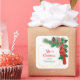 Un cardinal rouge vif est perché sur un bouquet de branches de pin d'un côté de ces jolis autocollants de scellement d'enveloppe pour les Fêtes. Inclus dans le bouquet sont des cônes de pin, des brindilles de verdure et des cannes de bonbon. Un mince cadre doré entoure le texte stylisé "Joyeux Noël" en rouge et votre texte personnalisé en vert. Festif pour les sacs-cadeaux et les paquets aussi !