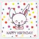 Mignons lapin lapin blanc avec oreilles et joues roses et petits orteils roses sur un arrière - plan de pois colorés. Ci-dessous est un modèle lisant heureux anniversaire que vous pouvez utiliser tel quel ou utiliser la zone modèle pour changer à votre propre texte.
