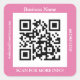 Personnalisez cet autocollant avec votre code QR dans n'importe quelle couleur, mais assurez-vous qu'il est assez sombre pour scanner. Nom commercial, site Web et code numérique sont en texte blanc avec bordure rose. Cliquez sur "Edit Using Design Tool" pour modifier les couleurs et les styles de type.
