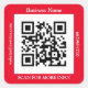 Personnalisez cet autocollant avec votre code QR dans n'importe quelle couleur, mais assurez-vous qu'il est assez sombre pour scanner. Nom de l'entreprise, site Web et code de numéro sont en texte blanc avec bordure rouge. Cliquez sur "Edit Using Design Tool" pour modifier les couleurs et les styles de type.