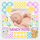 Cette annonce de naissance de bébé au design doux met en vedette une photo paisible de nouveau-né encadrée par un collage floral à carreaux de couleur pastel. La bordure patchwork mélange gingham, pois et blocs de motifs délicats en rose, bleu, jaune et violet, rehaussés de fleurs illustrées charmantes et de motifs de personnages adorables. Le mélange de textures crée une sensation douce et artisanale avec une ambiance chaleureuse et fantaisiste. Parfait pour les annonces de naissance, la décoration de nurserie ou les cadeaux souvenirs, ce design associe des couleurs douces, des détails ludiques et un charme sincère.