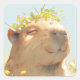 Un capybara serein se tient paisiblement au milieu de fleurs sauvages jaunes fleuris, portant une délicate couronne florale de feuilles verts et de minuscules fleurs. Les yeux fermés doucement et le sourire content, ce charmant capybara rayonne de pure tranquillité et de bonheur. Les couleurs pastel douces et l'éclairage doux créent une atmosphère chaleureuse et paisible, ce qui en fait un autocollant délicieux d'inspiration nature. L’arrière - plan marie le blues et le vert doux, complétant l’expression douce du capybara et ses tons terreux.