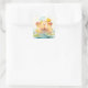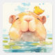 Illustration charmante et ludique d'un capybara flottant paisiblement dans l'eau avec un petit oiseau jaune perché sur la tête. L'expression du capybara est calme et pleine de contenu, avec son museau légèrement surélevé. Autour, des coussinets de lys et des ondulations douces créent un cadre aquatique serein. L'arrière - plan est composé de ciels bleus doux aux nuages moelleux, ce qui renforce l'atmosphère paisible. L'effet aquarelle donne à l'image un aspect fantaisiste et apaisant, parfait pour les amoureux des animaux et les amoureux de la nature.