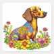 Belle illustration d'un chien plus blanc entouré de fleurs en jaune et rose.