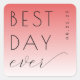 Cet autocollant de mariage présente un design moderne et ludique avec un fond dégradé passant du rose corail profond au pêche clair. La phrase "BEST DAY ever" est affichée bien en vue en lettres majuscules grasses associées à une écriture cursive élégante, créant un impact visuel saisissant. La mise en page est propre et équilibrée, mettant l'accent sur le message de célébration sans motifs ou éléments supplémentaires. Parfait pour ajouter une touche personnelle à votre jour spécial, cet autocollant capture une ambiance enjouée et joyeuse, ce qui le rend idéal pour les mariages et autres célébrations importantes.