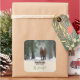 Fabriqué à la main avec des autocollants d'amour avec une photo d'un cheval brun avec une longue crinière blanche scrupuleuse. Debout dans une forêt avec des flocons de neige qui tombent tout autour.