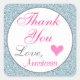 Parties scintillant chic, girly et glam bleu clair scintille princess "Merci" autocollant carré avec élégante écriture rose chaud et gris. Vous pouvez facilement ajouter le nom de votre choix et modifier la couleur et la police en utilisant l'option personnaliser !
