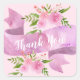 Autocollant carré rose pâle féminin et joli avec les mots "Merci" dans un élégant script blanc, sur un fond de bannière en ruban lilas pourpre. Deux magnifiques arrangements floraux aquarelles printaniers avec des roses roses et de la verdure complètent le design.