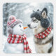 Un chien coquin et un bonhomme de neige se font face, entourés d'un paysage enneigé