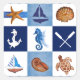 Dessin original peint à l'aquarelle par Sandra Gale, avec des blocs de dessins sur le thème nautique comme le poisson étoilé, l'ancre, le navire, la tortue et les coquilles. Conception idéale pour l'été, les maisons de plage, les bungalows ou pour tous ceux qui aiment la plage, l'océan ou le poisson.